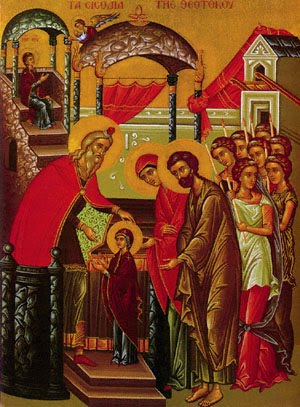 Today is the prelude of God’s pleasure and the proclamation of man’s salvation. The Virgin is clearly made manifest in the temple of God and foretells Christ to all. Let us also cry out to her with mighty voice, “Hail, fulfillment of the Creator’s dispensation.”