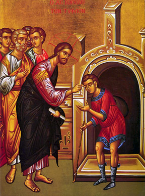The icon of the Sunday of the Blind Man depicts the biblical story of Christ healing the man who was blind since birth. Our Lord is shown placing the clay on the eyes of the man. He is with his disciples who are questioning Christ about the source of the man’s affliction. The blind man is shown with his hand outstretched toward Christ expressing his faith and willingness to receive healing and grace from the Son of God. Our Lord has in His hand a scroll, which directs us to His statements, “I am the light of the world,” (John 9:5), and “The Spirit of the Lord is upon me, because he has anointed me to preach good news to the poor. He has sent me to proclaim release to the captives and recovering of sight to the blind, to set at liberty those who are oppressed,” (Luke 4:18). This are clear statements of the Gospel of salvation that comes through Christ. The scroll may also represent the role of Christ as Judge as depicted in Matthew and Revelation, and also later in the same passage on the healing of the blind man (John 9:39), “Jesus said, “For judgment I came into this world, that those who do not see may see, and that those who see may become blind.”