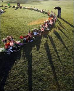 BLACKSBURG, Va. — Kelly White and her two children visited the semicircle of memorials on the Virginia Tech campus, leaving 32 pink tulips — one for each victim in last week’s massacre. They also placed a tulip on the stone for gunman Seung-Hui Cho.